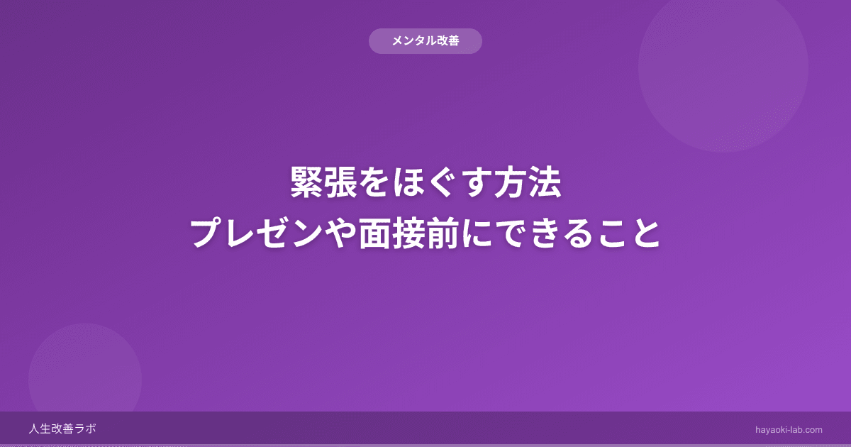 プレゼンや面接の前に試してほしいテクニックが3つあります。1つ目は「4-7-8呼吸法」。4秒で吸い、7秒止め、8秒で吐く。これを3回繰り返すと副交感神経が活性化し、心拍が落ち着きます。2つ目は「パワーポーズ」。両手を腰に当てて胸を張り、2分間立つ。これだけでコルチゾールが低下しテストステロンが上昇するという研究があります。3つ目は「最悪のシナリオを受け入れる」。「失敗したらどうなるか」を具体的に考え、「まあ、それでも人生は終わらないな」と納得すると、過度な緊張が和らぎます。