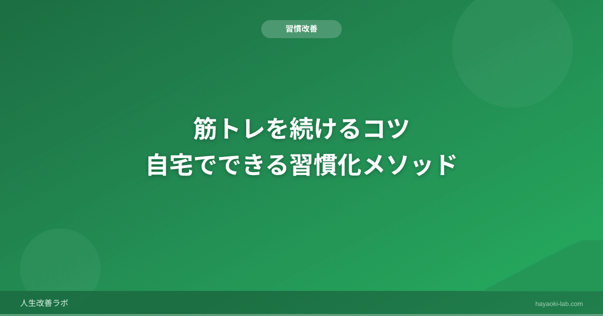 自宅筋トレを続けるコツは、ハードルを下げて「やらない理由」をなくすことです。1種目5回から始め、時間と場所を固定し、やる気がない日も最低限だけやる。この仕組みを作れば、筋トレは自然と生活の一部になります。